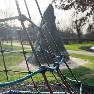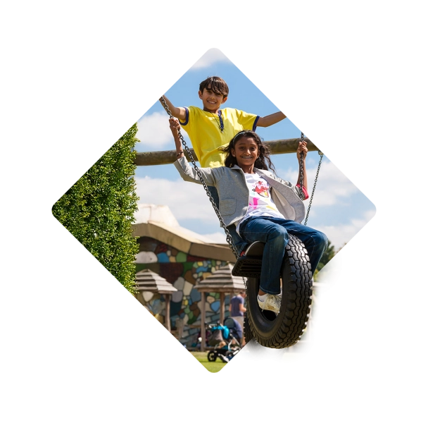Deze groene oase nodigt je uit om lekker buiten te spelen! Trek je lekker terug in de schaduw van de bomen of speel in het zonnetje! Ga op avontuur en kom van alles tegen: van een kabelbaan, kleine waterspeelplaats tot draaitollen, trampolines en een gigantische air-trampoline. Wie kan daar de allerhoogste sprongen maken?