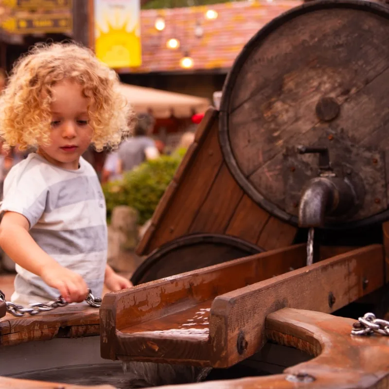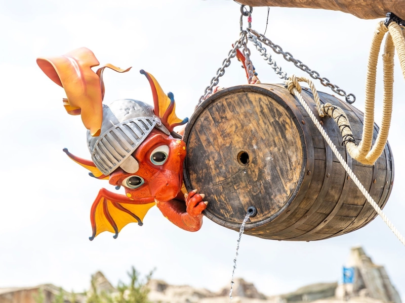 Since Sparky the dragon has made house here, the storage for dirty dishes has become an adventurous water-playground! The watercourse starts at the well and goes through various obstacles through the area, passing barrels and pans. You can change all these to your liking. Splash around in and with the water. Maybe you'll run into Sparky too!